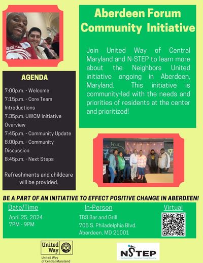 N-STEP held our first community forum last night at TB3 in Aberdeen. The community forum was supported by local church leaders, residents, and United Way of Central Maryland grant team. United Way of Central Maryland is investing in your community, join us in making positive changes. This initiative is community -led with the needs and priorities of residents at the center and prioritized.